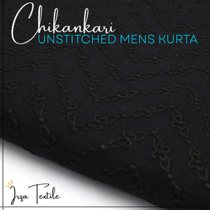 Close-up of an un-stitched embroidered black kurta fabric with text overlay indicating the brand 'Chikankari' and the description 'UNSTITCHED MENS KURTA'.